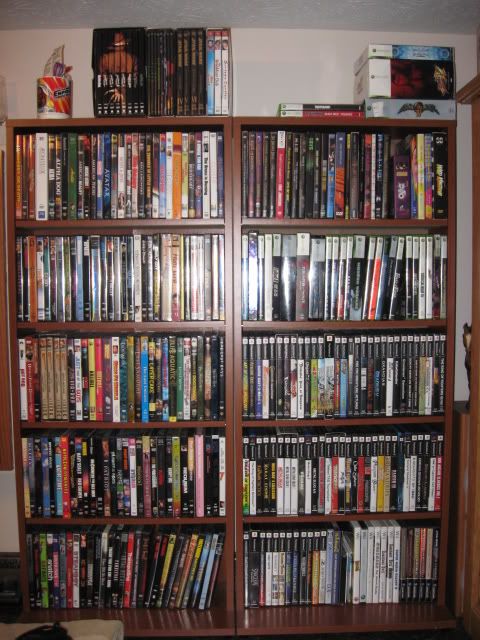 Here are my DVDs on the left, the right shelf holds Band/Music DVDs on the top shelf with Xbox360 games on the next shelf down. The rest are PS2 games. The Bottom shelf has some more PS2 games, and my Wii and Gamecube collection.