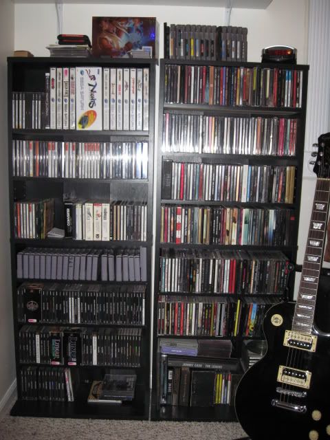 The left shelf has my Sega Saturn import/US games, then Dreamacast games, Video Game Soundtracks, SNES carts, PS1 games, my 2 Turbo Duo games, Dracula X and Ys 1 & 2. The right shelf is CDs, with my NES carts on top. Looks like my Les Paul snuck in too, my marshall amp is next to that, but I guess that doesn't fall into game collection...