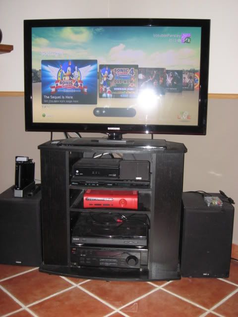 Here's my main setup. Samsun 42 Plasma. My JVC 5 channel Surround sound system with Yamaha front speakers. Red 360. Black Wii with my wavebird censor plugged in. On top of the right speaker is my Dreamcast VGA box. There's my turntable too. And Upconvert DVD player.